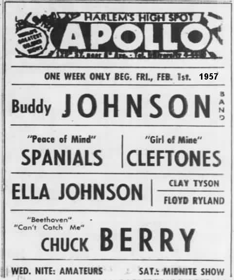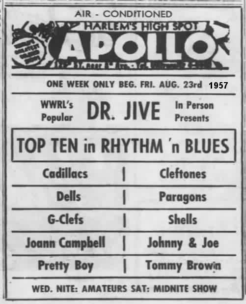 The Cleftones joined a Hal Jackson show at the Apollo beginning May 10, 1957. They shared the stage with the Teenchords, Clarence Henry, the Love Notes, the Pearls, the Cellos, and Chubby Newsome.