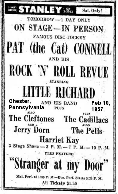 On February 1, it was back to the Apollo, this time with Chuck Berry, the Spaniels, Clay Tyson, and the Buddy Johnson Orchestra (featuring Ella Johnson). On the 2nd (just in time for Groundhog's Day!) "Why Do You Do Me Like You Do" was rated "excellent," along with the Turbans' "Valley Of Love," the Solitaires' "Walking Along," and the Penguins' "Will You Be Mine." After that, it was off to the Stanley Theater (Chester, Pennsylvania) for a February 10 show along with Little Richard, the Cadillacs, and Jerry Dorn.