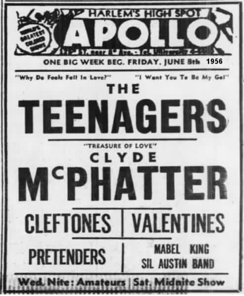 Then, the Cleftones went into the Apollo Theater for the week beginning April 20, 1956 (advertised in Apollo's ad as the "Cliftones"). With them, were Illinois Jacquet, George Kirby, the Sensations, and Della Reese.