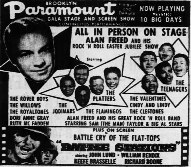 Also in February there was another Alan Freed show. This one was at the New York Paramount, and featured the Teenagers, the Platters, the Cleftones, the Cadillacs, Ruth Brown, Nappy Brown, and an obscure local group called the Duponts (whose lead singer, in a "kid-sound" vein, would soon become "Little Anthony"). These shows were grueling, and one morning Teenagers' bass Sherman Garnes overslept and had to be replaced, for the first show, by Warren Corbin.