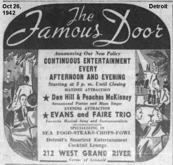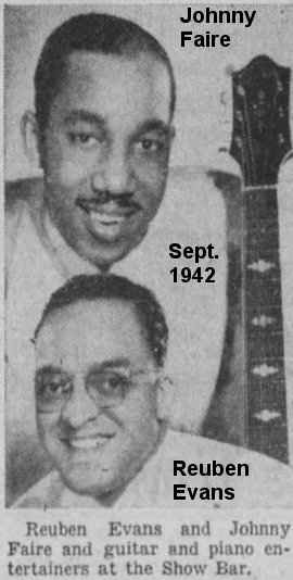 The September 26, 1942 Detroit Tribune said: "When they ask for songs and dance music, Reuben Evans and Johnny Fire [sic] can really give it in sepia fashion. Reuben is the talented brother-in-law of Dr. Seabrooke. [Bet you didn't know that.]" After that, they appeared at Detroit's Famous Door. The October 23 Detroit Free Press said: "Don Hill, the boogie-woogie pianist, and Peaches McKinny keep things going until dusk, then Evans and Faire, piano and guitar duo, take over."