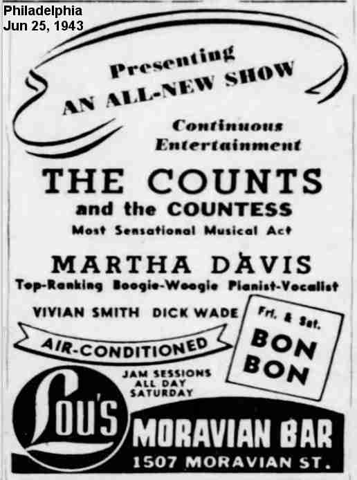 The Counts and the Countess, recruited from the Mutual network, are scheduled to open Monday night [June 21] at Lou's Moravian Bar, 1507 Moravian St. In the continuous shows are Dick Wade, Martha Davis, Vivien Smith and The Cabin Boys. Added Friday and Saturday nights are Bon Bon and his songs.