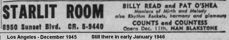 They finished out the year at the Starlit Room on Sunset Boulevard and were still there in early January 1946. The next month, they, along with the Hollywood 4 Blazes and Cee Pee Johnson, were at the Swing Club.