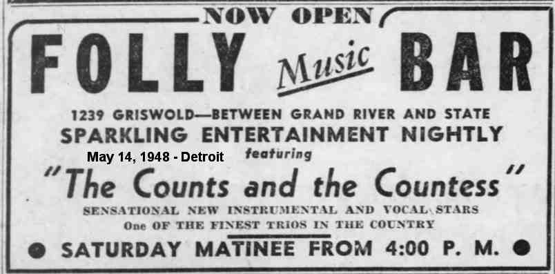 What I do know is that, by mid-May 1948, The Counts & The Countess were back in Detroit and appearing at the Folly Music Bar, a new club which had opened on May 14. "Feature performers", said the May 14 Detroit Free Press, "will be the Counts and Countess, a smart instrumental and vocal trio, lately in California."