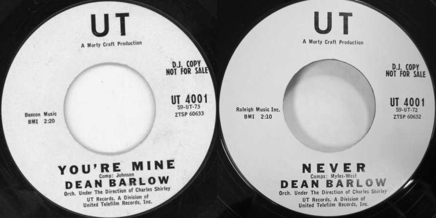 In 1959, Joe Davis released some old Dean Barlow sides on his Beacon label, possibly to compete with Dean's current solo remake of "You're Mine" (on the U.T. label; on it he's backed up by Arthur Crier's Halos). Dean maintained that this was the finest record he ever did, although the heavily-stringed arrangement was such that it was hard to dance to and teens didn't like it. Joe Davis, who owned the publishing rights, got an injunction against it and there are very few copies around today. More successful in terms of airplay was 1962's "Third Window From The Right" on Lescay. There were also solo releases on Warwick, 7 Arts, Rust, and TCF.