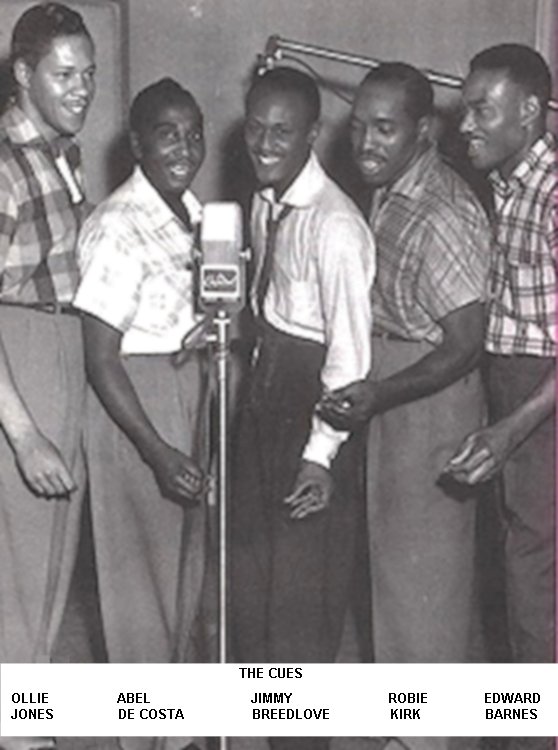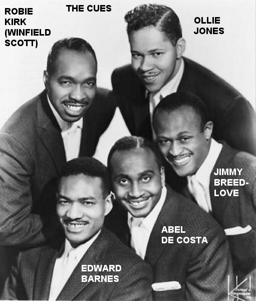 To take the idea one step further, Jesse Stone, Atlantic pianist and arranger, conceived the idea of having a permanent, resident backup group for Atlantic's single artists. (Up until then it was a haphazard affair. For example, when they needed a "group" to do the chorus on Joe Turner's "Shake, Rattle and Roll," it was comprised of Stone, with Atlantic executives Ahmet Ertegun and Jerry Wexler!) To implement his idea he contacted Henry Oliver "Ollie" Jones, well-known second tenor (the original tenor lead of the Ravens, who then went to the 4 Notes, and finally the Blenders). In 1954, he was dabbling with songwriting, since the Blenders were relatively inactive. Stone also asked baritone Winfield Scott to join. (While he used his real name as a songwriter, as a singer he was usually known as "Robie Kirk.") The other original members were a tenor named Dave and a bass named Frank (whose last names Ollie Jones didn't remember). The quartet was named the Cues.