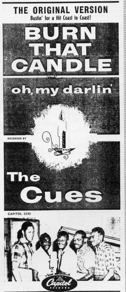Also in August, the Cues secured a contract with Capitol records and held their first two sessions. On August 11, they recorded "Momma Loves Poppa," "Burn That Candle," and "Charlie Brown"; on August 24, they added "You're On My Mind," "Much Obliged," "Oh My Darlin'," and the first, unreleased, version of "Why". "Burn That Candle" (written by Robie Kirk and led by Jimmy Breedlove)/"Oh My Darlin'" (led by Ollie Jones) came out in September. "Burn That Candle" was immediately covered by Bill Haley & the Comets, who had a nice hit with it.