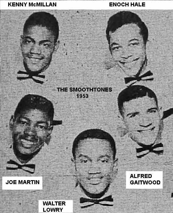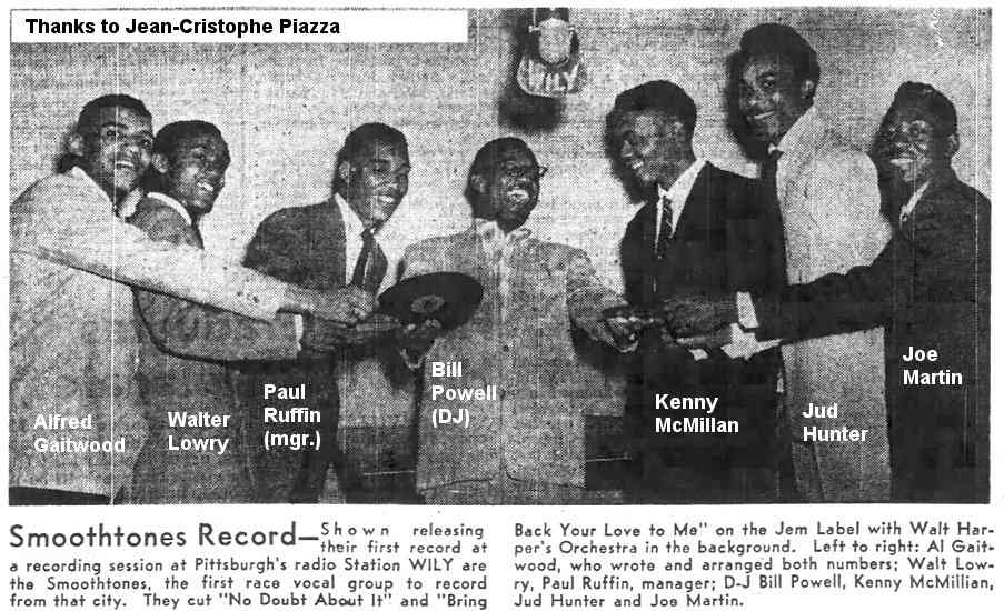 In 1953, however, another kind of paradise beckoned, and Alfred was transferred to a reserve unit in Pittsburgh. Here, he hooked up with some local civilians and began singing with them as the "Smoothtones". They were: Enoch Hale (first tenor), Joe Martin (second tenor), Walter Lowry (baritone), and Kenny McMillan (bass). When Enoch Hale was drifted in 1954, he was replaced by first tenor Jud Hunter. The Smoothtones recorded two songs (both written and led by baritone Alfred) for Lennie Martin's local Jem label: "Bring Back Your Love"/"No Doubt About It." These were released in June 1955.