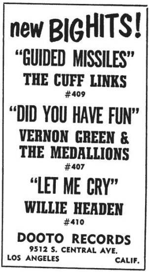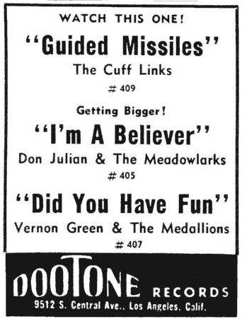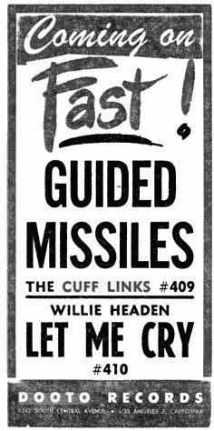 Although in existence for several years, Dootone was finally forced to change its name by the Duotone Company (makers of phonograph styluses). Thus, "Guided Missiles" had the distinction of being both the last Dootone and first Dooto release. The change was announced the week of January 26, 1957, although "Guided Missiles" had already been reissued on Dooto in December. [I'm always amazed when record companies do something and then, later on, announce that they're going to do it.]