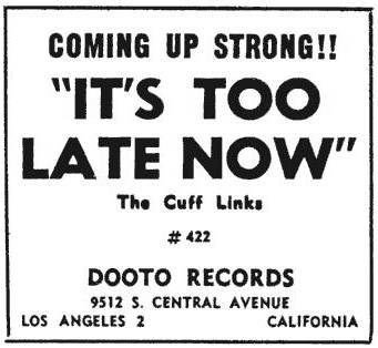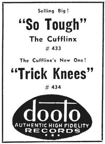 It's possible, however, that there was some kind of injunction sought by Challenge Records. The Cufflinx' "So Tough" was never reviewed, and only a month later, in February, Dooto released their second record: "A Fool's Fortune," backed with "Trick Knees." Reviewed on March 10, 1958, both sides were ranked "good". Other reviews that week included the Du Mauriers' "All Night Long," the Dominoes' "Solitude," the Crowns' "Kiss And Make Up," Bobby Freeman's "Do You Wanna Dance," the Caddys' "Ain't You Gonna," the Tremaines' "Jingle Jingle," the Serenaders' "I Wrote A Letter," and the Ebon-Knights' "First Date." In spite of "So Tough" not being reviewed, however, Dooto ran ads for it all through the month of March 1958. Also, in a blurb about a show at the Paramount Downtown (Los Angeles) beginning on March 12, the Cufflinx' "So Tough" was mentioned. (Others on that show were Roy Hamilton, Thurston Harris, the Clovers, Red Prysock, Wynona Carr, Don & Dewey, and my personal favorites: "many, many more.")