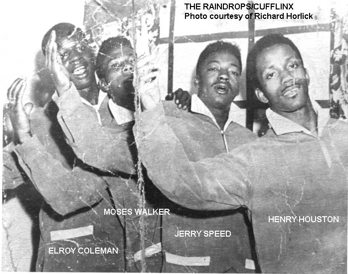 In case you're not confused enough, enter the "Cufflinx." Around 1952, a group called the Rain Drops formed on the U.S.S. Noble, an Attack Transport (APA 218) that had landed the first Marines in Korea. They consisted of Henry Houston (lead tenor), Moses "Moe" Walker (first tenor), Jerry Speed (second tenor, baritone, and alto), and Elroy Coleman (bass). They patterned themselves after the Dominoes, the Clovers, the 5 Royales, and the Midnighters and performed in clubs in and around San Diego.