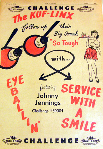 The Kuf-Linx second session was held on February 27, 1958. The four sides recorded were "Eyeballin'," "Service With A Smile," "Climb Love's Mountain," and "All That's Good." Their next Challenge record (as "The Kuf-Linx, Featuring John Jennings") was "Eyeballin'," backed with "Service With A Smile." Released in March 1958, it was reviewed (again with both sides "good") on April 7. Other reviews that week were for Chuck Berry's "Johnny B. Goode," Fats Domino's "Sick And Tired," the Rays' "Rags To Riches," the Gladiolas' "Shoop Shoop," the Bobbettes' "Zoomy," the Moonglows' "Soda Pop," the Ladders' "I Want To Know," and the Ospreys' "Do You Wanna Jump Children."