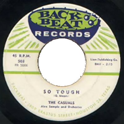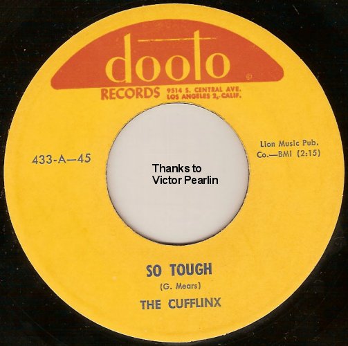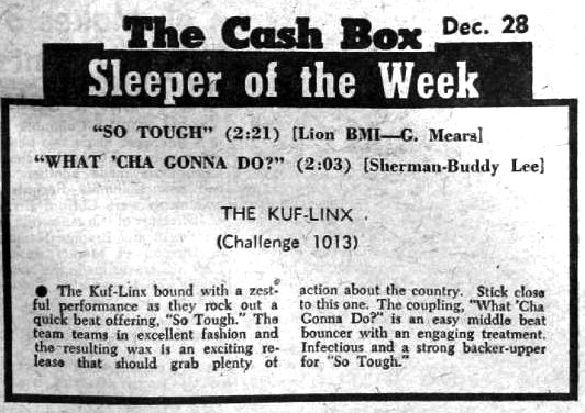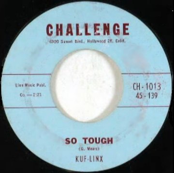 In two sessions, the Kuf-Linx recorded three records for Challenge, a Los Angeles label, one of whose owners was Gene Autry. On December 10, 1957, they recorded a cover version of the Casuals' "So Tough" (with "What'cha Gonna Do" as the flip). Released that same month, it was reviewed (both sides "good") on December 30, 1957, along with Jesse Belvin's "My Satellite," the Penguins' "That's How Much I Need You," the Monitors' "Closer To Heaven," the Sputniks' "Hey Maryann," and the Rajahs' "Shifting Sands" (rated "poor"). Keep in mind that John Jennings, lead on 'So Tough,' had also been the lead on the Jubalaires "Jube's Blues" back in 1947! Challenge would re-release "So Tough" twice more, each time with a different record number. The first time was in 1961; the second time hasn't yet been dated.