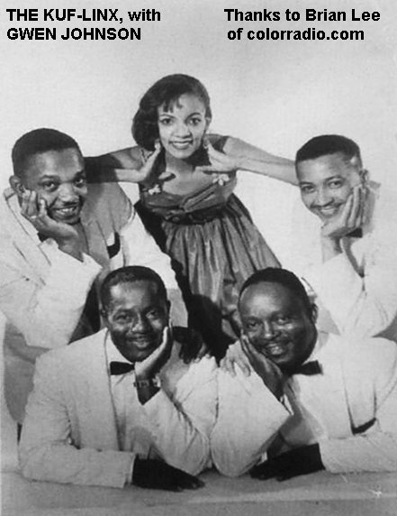 However, waiting in the wings was a group that called itself the Kuf-Linx. The members, three of whom Doug Seroff interviewed in the early 1980s, were: John Jennings (lead tenor), Johnny Woodson (tenor), Gaines Steele (tenor), George "Biggy" McFadden (bass), Leo Z. Manley, Darrell Johnson, and Gwen Johnson. That's right, there were seven of them. Jennings and McFadden had been in the Jubalaires in the mid-40s. Leo Z. Manley was a well-known gospel lead singer, who had been with the Heavenly Gospel Singers and the Stars Of Harmony. Gaines Steele, younger brother of gospel great Silas Steele, sang with Detroit-area gospel groups and a West Coast Ink Spots group (with Clifford Givens); in the mid-60s, he was a member of the 4 Tunes. Gwen Johnson was a Los Angeles session backup singer singer (it's not certain if she was the Gwen Johnson who had a couple of releases on Peacock), who went on to become part of 1969's The Brothers And Sisters Of Los Angeles (whose voices included Billy Storm, Chester Pipkin, Fred Willis, Don Wyatt, and Clydie King, among many others).