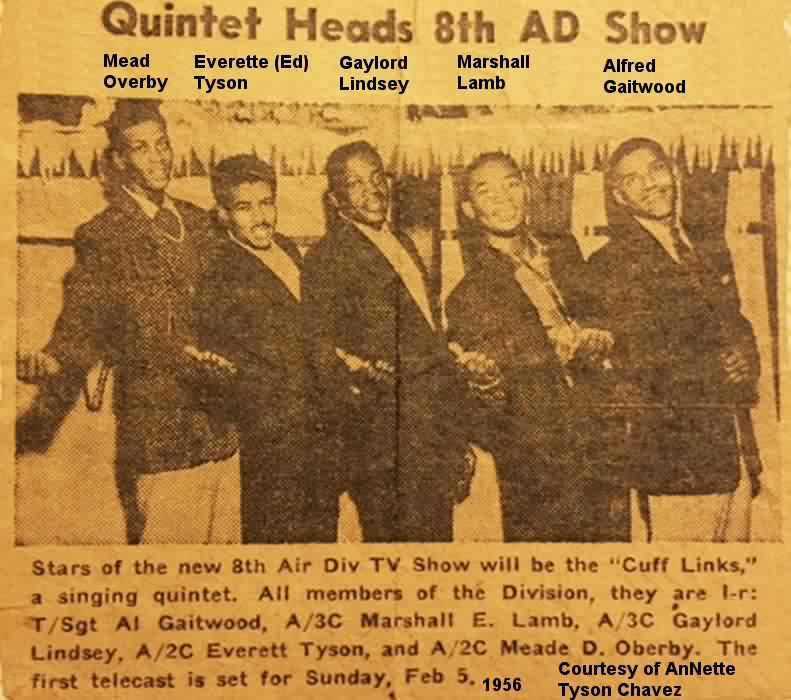 The members of the Cuff Links changed rapidly. There were several early members, such as Mark Green and Billy Gray, who were in and out of the group. The accompanying photo, from late January 1956 (when they were slated to be stars of the Eighth Air Division TV Show), shows "Meade Oberby" (actually Mead Duncan Overby) and Gaylord Lindsey, two names I'd never heard before, along with Alfred Gaitwood, Everette "Ed" Tyson, and Marshall Lamb..