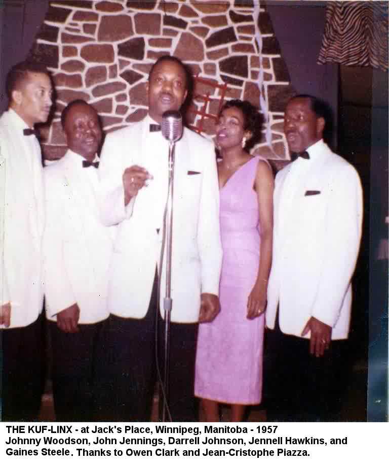 So what happened to the Kuf-Linx then? I heard from Owen Clark in Manitoba, who told me that in 1957 the group had played the Rancho Don Carlos in Winnipeg. They liked Winnipeg so much that they returned in 1958 and took over a nightclub called "Jack's Place," where they remained for at least part of 1958 and 1959. By this time, the group was a more manageable quintet, consisting of John Jennings, Johnny Woodson, Gaines Steele, Darrell Johnson, and "Jennell" (most probably Jennell Hawkins, who had recorded "This Time It's Real" with Richard Berry on Flair in 1954). Just to keep it interesting, however, they added trumpeter Frank Lewis. Johnny Woodson went on to record a couple of singles for Spry and Imperial in the early 60s.
