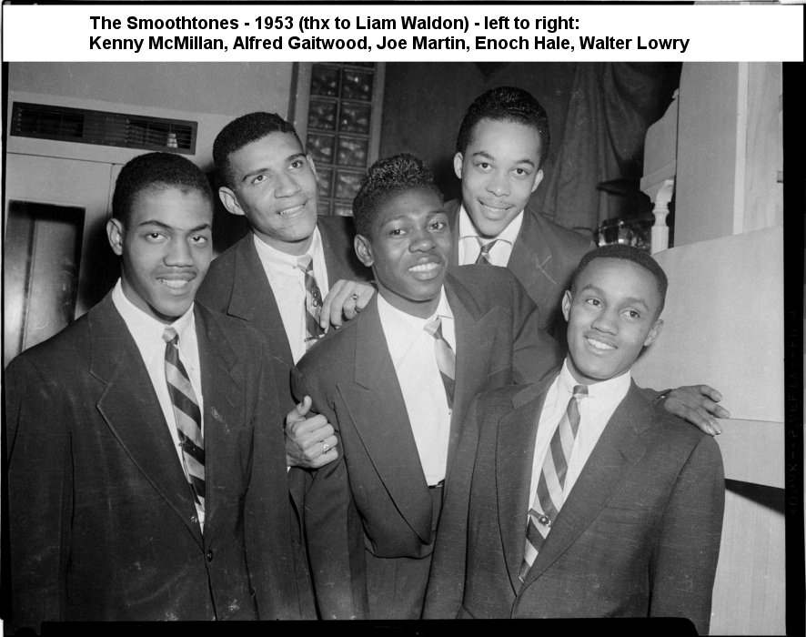 Up until then, the Smoothtones' appearances were mostly record hops with DJs Bill Powell (who would later break "Guided Missles" in Pittsburgh over station WILY), Leon Sykes (WMBS), Jay Michael (WCAE), Barry Kaye (WJAS), and, of course, Porky Chedwick (WHOD). After the record was released (with "No Doubt About It" doing well locally), there was a series of one-nighters, but all in the Pittsburgh area. This continued until late 1955, when Alfred Gaitwood was once again reassigned by the Air Force. His place in the Smoothtones was taken by Sylvester Brooks (with whom the group subsequently cut "It's Too Late Now," a tune that they'd been practicing with Alfred). [What little information about the Smoothtones exists here was taken from Cark Janusek's article on the group which appeared in Echoes Of The Past #16 in 1991. Carl had interviewed Jud Hunter for the article; when I spoke with Alfred Gaitwood, he remembered being with the Smoothtones, but none of their names.]