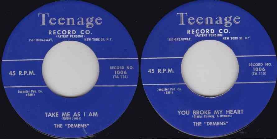 Then they started looking around for a manager and a recording contract. The manager they found was James A. Dailey, who also managed the Bobbettes. In spite of having a manager, the Demens themselves hit the phone book and came up with Teenage Records, at 1587 Broadway.