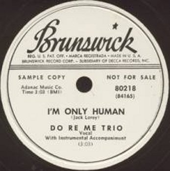 In April 1953, the "Do Re Me Trio" showed up on Brunswick, a subsidiary of Coral Records, which was, itself, a subsidiary of Decca (as Commodore had been). The record was "I'm Only Human"/"I'll Never Stop Being Yours".