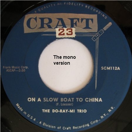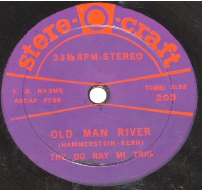 Then, there were some recordings by the guys (now the "Do-Ray-Mi Trio") that appeared on Morty Craft's Craft and Stere-O-Craft labels in 1959. Two singles were issued ("On A Slow Boat To China"/"Saturday Night Fish Fry" and "Old Man River"/"Oo-Wee"), as well as an LP (later re-released on Hi-Life) conveniently called The Do-Ray-Mi Trio. The Seeberg Juke Box Company financed the venture, an early experiment with stereophonic sound. The two 45 RPM singles were issued in mono (on Craft) and stereo (on Stere-O-Craft); the stereo versions were probably used to test the practicality of stereo singles for juke box consumption. With a sound which was clean and uncluttered, the Do Re Mi Trio was apparently viewed as ideal for stereophonic separation in recording. Note that while the mono and stereo singles were released on different labels, both versions of the LP were on Stere-O-Craft (catalog numbers RCS 508 for stereo and 508M for mono). The liner notes for 508M say that it's monaural, "made from a genuine true stereophonic master" and promised superior sound quality as a result.
