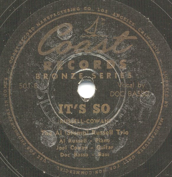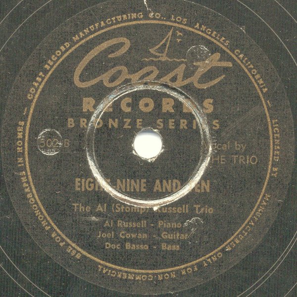 There was a little blurb in the June 23, 1945 Billboard that said: "Nat [Vincent] got the Al (Stomp) Russell Trio (Al Russell, Joel Cowan and Doc Basso) a Peerless Record date and they waxed eight of their tunes. Four of them are Shy Ann, Kelly With The Jelly, Eight-Nine-Ten, and It's So". Peerless and Coast were both owned by Paul Mayer (with Charlie Washburn as the recording director).