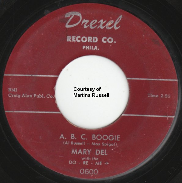 Around 1949, the Do-Re-Me Trio backed up a singer named Mary Del on "A.B.C. Boogie" (a tune Al Russell had written) and "Love You". "A restaurant owner backed her and paid for the session", said Al, "but she never made it big." It was released on Drexel, a tiny Philadelphia label. In 1954, "A.B.C. Boogie" was revived by Bill Haley and the Comets, appearing as the flip of "Shake, Rattle, and Roll", and prompting Drexel to re-release Mary Del's version in October of that year. (My feeling was that the Trio practiced it around Gabler, who remembered it years later.) Because royalties are also heaped on a song that's the flip side of a tremendous hit, the tune helped Al pay for his house. Mary subsequently released a cover of Ruth Brown's "Oh What A Dream" and had some releases on the Cadence label in the mid-50s.