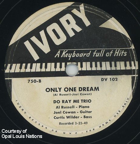 Three records, by the "Do Ray Me Trio", appeared on Dagmar Van Haur's Ivory label in 1949. "Only One Dream" (released in August) is a fine example of their style. Al Russell's lead vocal was supported by mellow instrumentation and even mellower "blow" harmonies from Cowan and Wilder. (It was coupled with "Tell Me You Love Me", led by Curtis Wilder.) They also put a frenetic instrumental backing behind Harold Conner, another Ivory artist, on "I'll Get You When The Bridge Is Down" (backed with "I Done No Wrong"). Their final 1949 Ivory release was "Rhumba Blues"/"I Couldn't Help It".