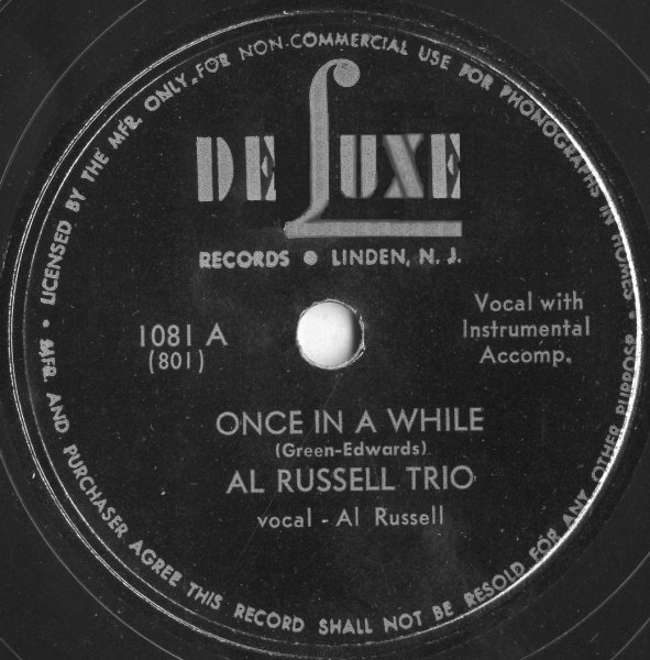 Then there were the recordings released on David & Jules Braun's De Luxe label of Linden New Jersey (not yet a part of King). At least one De Luxe release ("Just Plain Love") was purchased from 20th Century; two others ("Shy Ann" and "Down The Road A Piece") were purchased from Sapphire; the rest ("Once In A While", "Nobody Loves A Fat Man", and "Please Be Kind") are of unknown origin (they might have been unreleased masters purchased from either company, or actually recorded for De Luxe). All three releases came out in mid-1947. (Note that "Just Plain Love", an Al Russell composition, was also recorded that year by the Ink Spots.)