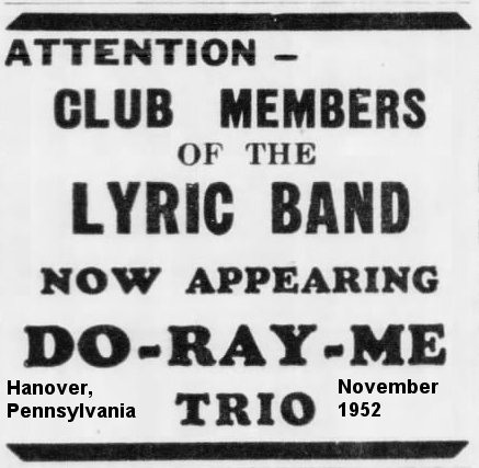 1956 saw some releases on the Trio's Variety label. The first of these (as the "Do Ray Me Trio") was a re-release of the prior year's Reet recordings: "Wrapped Up In A Dream"/"Why Did You Do It Baby? (Why O-Why O-Why)". Another (as the "Do Re Mi Trio"), probably from 1957, was "Holding Hands"/"Tell Me You Love Me". The earlier "Oo-Wee" and "I'm Used To You" were also re-released on Variety. The week of July 15, 1957, they were at the Lyric Band Club in Hanover, Pennsylvania.