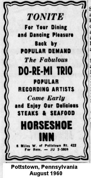 The Do-Re-Me Trio spent most of 1962 at the Embers Restaurant in Pennsauken, New Jersey. By then, following musical tastes of the day, they'd morphed into a twist band. They were also there for most of 1963 and a good chunk of 1964. They were so popular there that a new bandstand was constructed just for them.