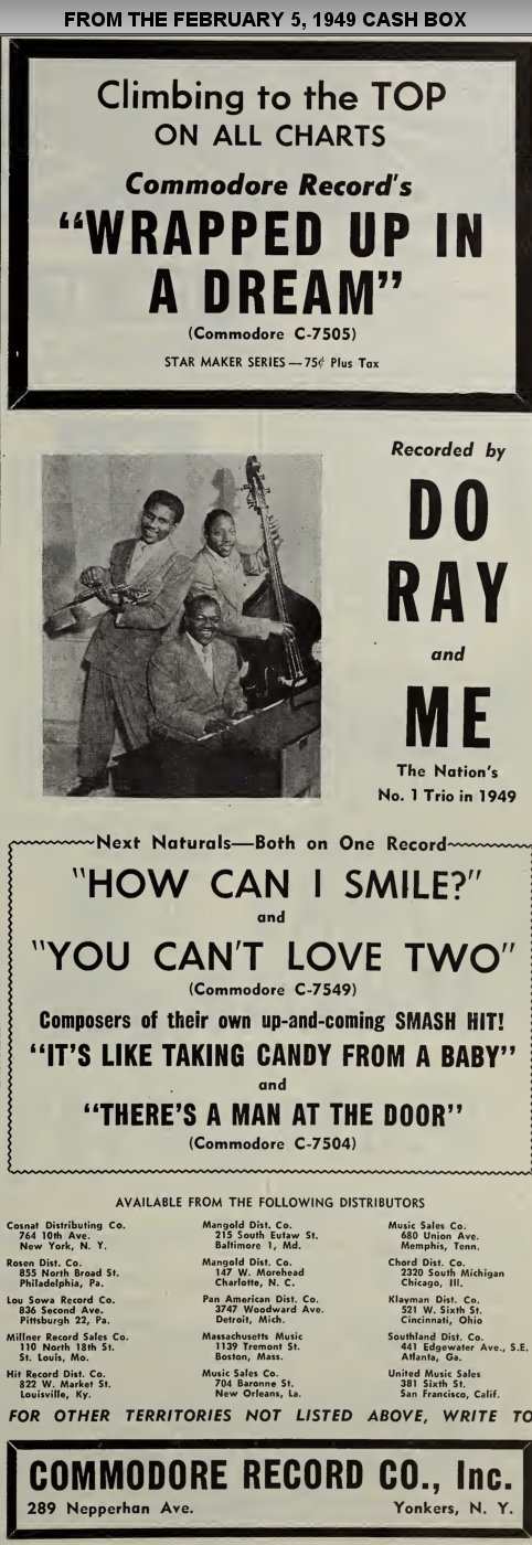 All the Commodore sides (there were 11 eventually released, although there's a gap of seven numbers in the masters) were recorded at the end of 1947 (to beat the deadline of January 1, 1948, the date on which the second AFM recording ban, organized by union leader James C. Petrillo, began). In the beginning, the strike was not strictly enforced; however, the AFM took out ads in the trade publications threatening suspension for any further violations of the ban. Thus, as "Wrapped Up In A Dream" was becoming the Trio's only chart hit (it went to #2, and remained on the R&B charts for 19 weeks), they refused to record any new sides for Gabler while the strike continued. The success of the song surprised the members of the Trio, who had spent little time arranging the tune before recording it. A really pretty song, it was originally recorded by the 4 Tunes (it had been written by Pat Best, their baritone), and there were subsequent versions by the Deep River Boys, the 4 Knights, the 5 Keys, and the Clovers.