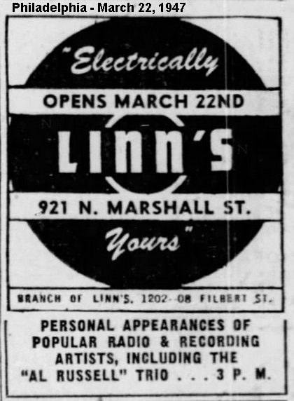 Also in March 1947, the Al Russell Trio appeared at Linn's, in Philadelphia. The ad seems to indicate that it's a record store.
