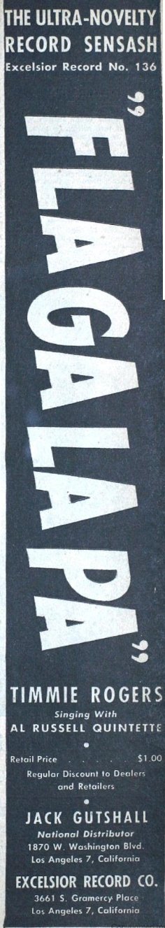 Then it was on to Otis René's Excelsior label (also in L.A.), where they started off by backing up Timmie Rogers on two records around September 1945: The first was "Fla-Ga-La-Pa"/"Drop Another Nickel In The Jukebox" and the second was "Daddy-O"/"Hep Paderewski From Basin Street". (The best thing about "Fla-Ga-La-Pa" is that it's probably the only R&B song to mention Punxsutawney, Pennsylvania.) An ad for "Fla-Ga-La-Pa" said that Timmie was backed by the "Al Russell Quintette", but I don't know who any other members might have been; they may have just added a couple for the session. They did several more Excelsior records, under their own name, throughout 1946, starting with a cover of Slim Gaillard's "Cement Mixer" in June (backed with "I Must Forget About You"). This was followed by "What Kind Of Love Is That"/"Three Little Words" in July, and "Cynthia"/"Mellow Jelly Blues". (Note that Timmie Rogers re-recorded "Fla-Ga-La-Pa" for Majestic about a year later, this time using the Palmer Brothers as backup. This version was not as enthusiastically received by Billboard.) Interestingly, a little blurb in March 1945 said that they were going to record for Excelsior; however, that was even before they'd recorded for Coast.