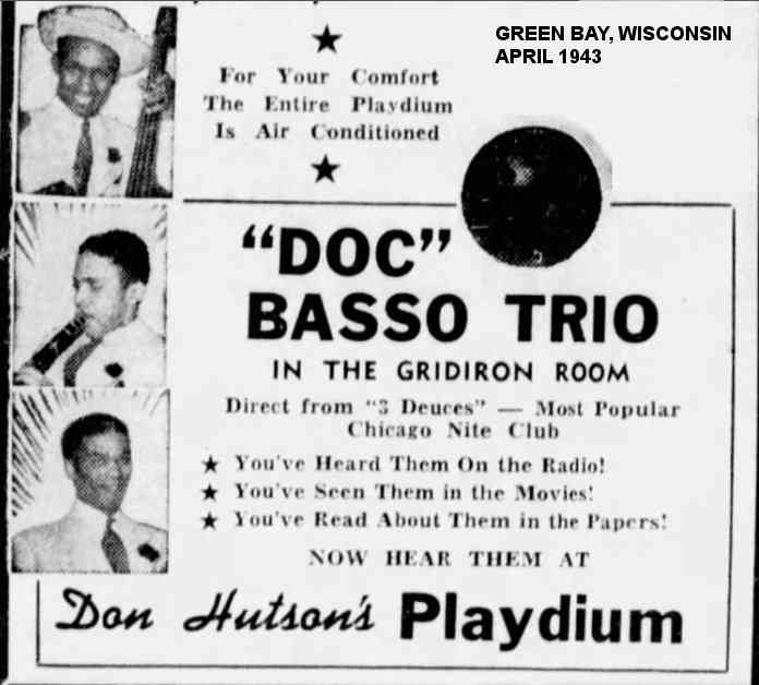 In early 1943, William Joseph (who'd been with Jimmy Noone) had a quartet, but it was the "Doc" Basso Trio by April of that year. There are some ads for them playing at the Playdium, a bowling alley in Green Bay Wisconsin (although it said they'd been at the 3 Deuces night club in Chicago).