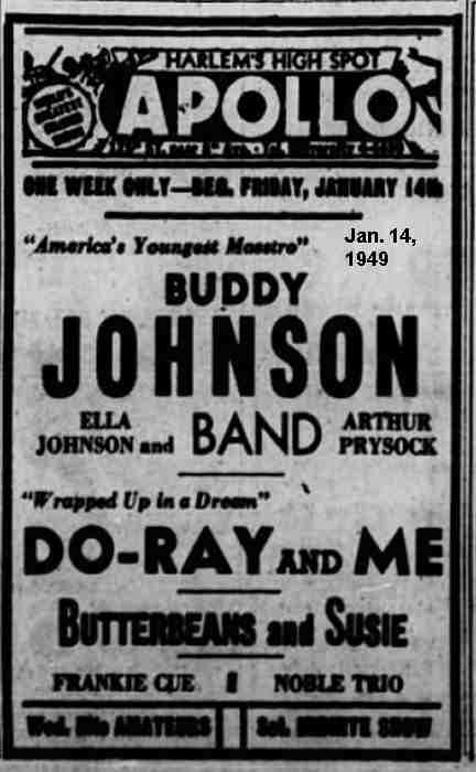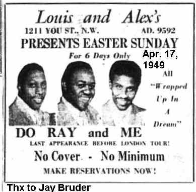 The guys started off 1949 with a gig at the Apollo Theater, the week of January 14 (advertised as "Do-Ray and Me"). Also on the bill was the Buddy Johnson Orchestra, with Ella Johnson and Arthur Prysock. The week after that, they were at the Howard Theater (Washington, DC), along with Buddy Johnson and Bull Moose Jackson.