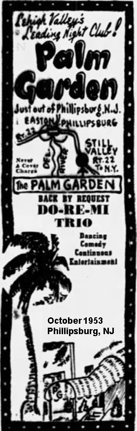 During that summer, the Trio appeared in Philadelphia, at the Club Zel-Mar and also at some clubs in nearby Wildwood, New Jersey, such as the Riptide.