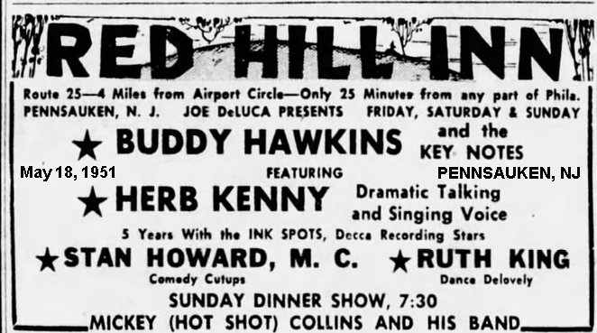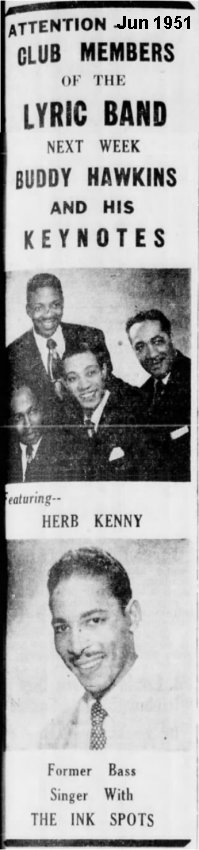 What's the problem with all this? In April, when they did their first Columbia session (with Buddy singing lead on "No More Dreams"), "Buddy Hawkins and the Key Notes" were still in existence! The Key Notes' last known booking was at the Gloucester Heights (in Camden, New Jersey) in late September 1951 (that one as the "Buddy Hawkins Quartet"). It's possible that although the Key Notes had broken up, they still had to honor a few last commitments. It's also possible that the commitments were honored by the Do-Re-Me Trio, masquerading under the Key Notes name. If so, some of the engagements must have been interesting (such as at the Red Hill Inn in Pennsauken, New Jersey in May and the Lyric Band in Hanover, Pennsylvania in June), since, for a short while, Herb Kenny (who'd just been thrown out of the Ink Spots by his brother, Bill) was a part of the group.