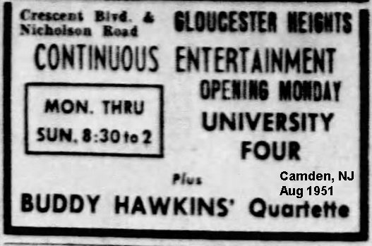 In November 1952, they played for the Shamokin Moose Lodge (in Shamokin, Pennsylvania). This was followed by an appearance for the club members of the Lyric Band in Hanover, Pennsylvania. December 1952 found them appearing at the Carver Bar (at the Glen Hotel, also in Philadelphia). From there, they went into DuMond's Musical Show Bar, once again in Philly.
