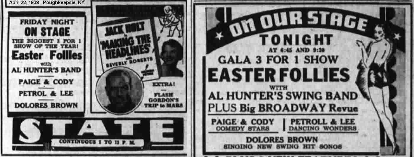 Dolores Brown is first mentioned as a professional singer when she appeared at the State Theater (Poughkeepsie, New York), for the big Easter Follies show, on April 22, 1938. She was billed as "Singing New Swing Hit Songs".