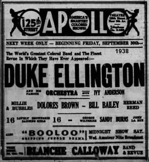 Dolores later said that she sang at the Apollo and did so well that she was hired by pianist Duke Ellington, as one of his band's singers. At that point, she dropped out of school. She has to be talking about appearing in the Apollo's Wednesday night amateur contests. The only time that Ellington could have seen her, was the week of June 10, 1938, when he was playing there (unless he dropped into the Apollo whenever he was in New York). Soon after that, however, Duke was hospitalized for a while, delaying her start with the band.