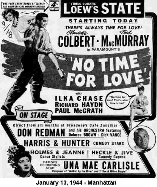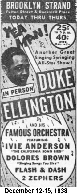 On September 22, 1938, Ellington opened at Loew's State Theater in Manhattan. Said the September 24 Pittsburgh Courier: "Aside from presenting Dolores Brown, a new vocal sender from the band; Ivie Anderson, an old superb voice standby; Jigsaw Jackson, the human corkscrew; and Stump and Stumpie [sic], sensational dance and comedy duo, Mr. Ellington presented several of his newer tunes which met with much favor and rocked the State from stem to stern."