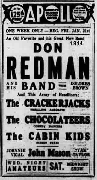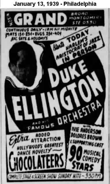 January 5-7 found them at Proctor's in Schenectady, New York. [For you non-New Yorkers, it's pronounced skih-NECK-tih-dee.] It was Duke Ellington, His Famous Orchestra and Big Revue, featuring Ivie Anderson, Chuck & Chuckles, Earl & Francis, and Dolores Brown. On January 13, it was a week at the Grand Theater in Philadelphia, with the 3 Chocolateers and Cook & Brown.