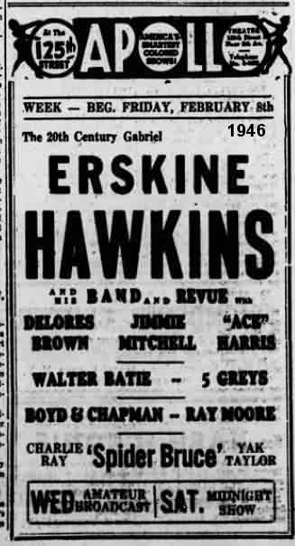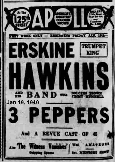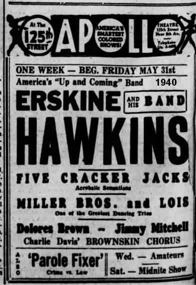 The May 4, 1940 New York Age told us that the Hawkins band was in Norfolk, Virginia, but they didn't say where. On May 19, the band was at Chicago's Savoy Ballroom, playing to a capacity crowd of 5000. It was back to the Apollo the week of May 31, this time appearing with the 5 Cracker Jacks ("acrobatic sensations"), and the Miller Brothers & Lois (dancers).