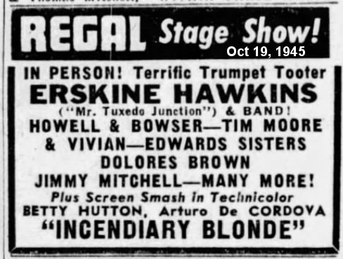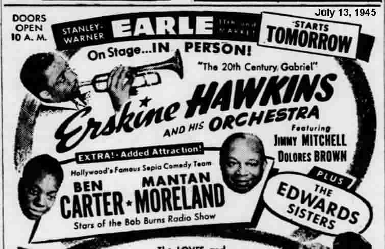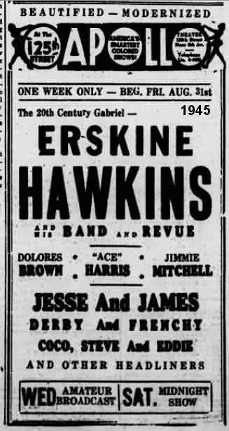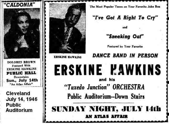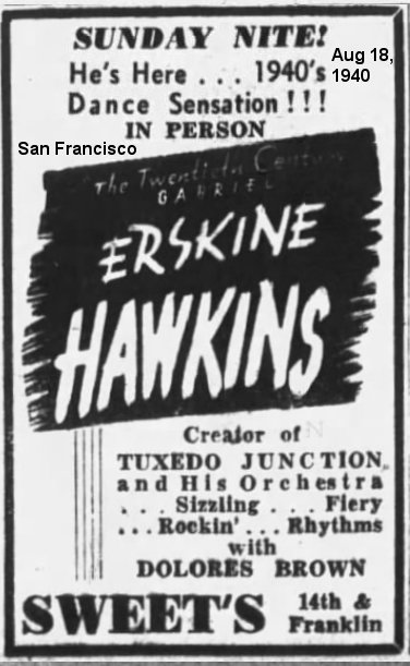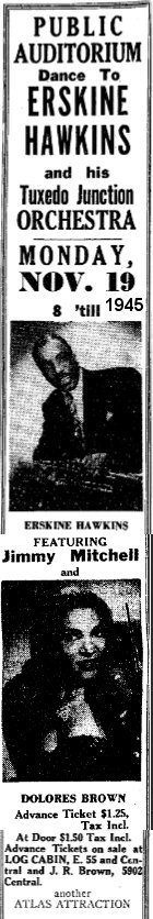 A new job. The August 17 California Eagle: "Dolores Brown, formerly with Duke Ellington's orchestra, has signed with Erskine Hawkins." Trumpeter Hawkins was nicknamed both "The Twentieth Century Gabriel" and "The Hawk".