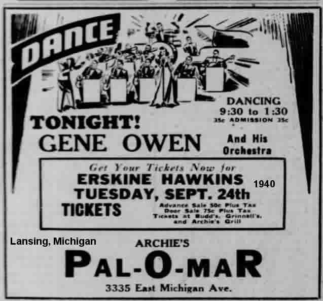 On September 21, 1940, the band appeared at the Fairgrounds in Dayton, Ohio; they'd been playing at an unspecified venue in Chicago. September 23 found them at the Greystone Ballroom in Detroit. The next night they were at Archie's Pal-O-Mar in Lansing, Michigan, and the night after that it was East Market Gardens (Akron, Ohio) at a charity ball.