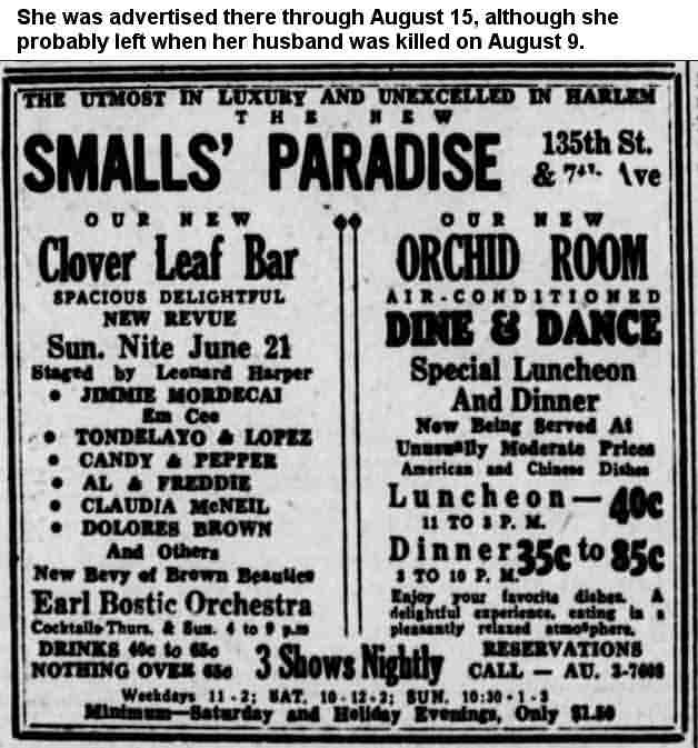 A June 20, 1942 advertisement for Smalls' Paradise in Harlem (135th Street and 7th Avenue), has Dolores appearing in the Clover Leaf Bar along with the Earl Bostic Orchestra. Her name was in ads through at least August 15. While there, she found time to appear with Bardu Ali's orchestra at Waller's Post Lodge on the Boston Post Road in Larchmont, New York. (Bahadour "Bardu" Ali had once been the bandleader for Chick Webb's Orchestra and would go on to be associated with Johnny Otis.)