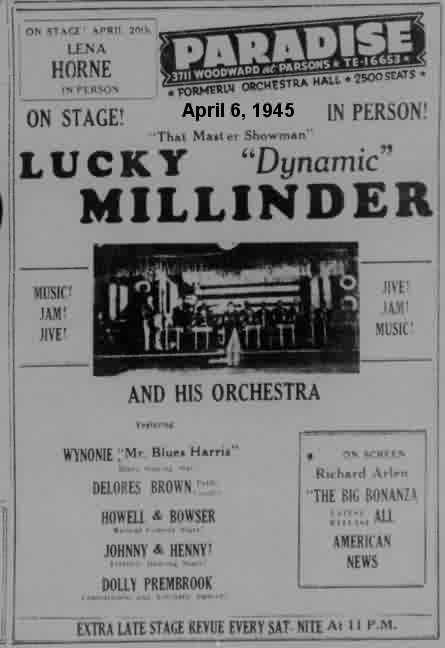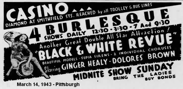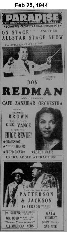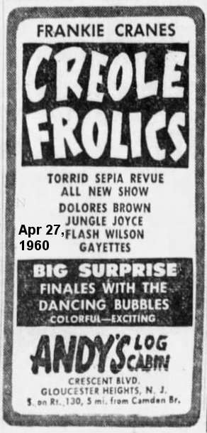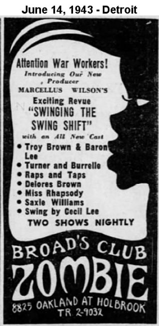 The July 23 Pittsburgh Courier talked about a different revue ("The Black Cat Frolics") that was to begin on July 25. It would star "Dolores Brown, Half-Pint Jackson [who would be in Vanita Smythe's "Low, Short, And Squatty" Soundie in 1946], Buddy Gilmore, the Lang Sisters, Basson [sic] Millington and his 'Swing Marvels', with the old reliable Amanda Randolph as mistress of ceremonies. Peaches and Palmer dance team is also in the revue."