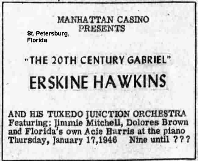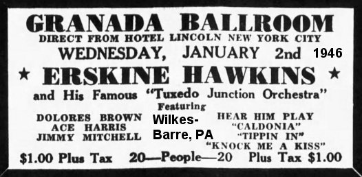 On January 2, 1946, they were at the Granada Ballroom in Wilkes-Barre, Pennsylvania, and on January 17 at the Manhattan Casino in St. Petersburg, Florida.