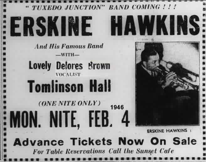 The Sub-Deb Social Club aided by promoter Rob Wright of the Brown Derby Cafe will bring "Tuxedo Junction" to Beal [sic] Street on July 5. Erskine Hawkins and his famous band coupled with Miss Delores Brown featured vocalist, plus the soothing voice of Jimmy Mitchell, will demonstrate to Memphians just how and why they are now one of the nation's topnotch sepia attractions. Delores is an Ellington find, having been employed in 1938 to temporarily fill the bill during the illness of his singing star, Ivy [sic] Anderson. Dee as she is affectionately called clicked immediately in 1939 she was signed by Tate and both leaped into prominence with the popularity of the now famous song "Tuxedo Junction." [Yes, that was all one sentence with no punctuation.] As usual the Church Park Auditorium will be the scene of the attraction.