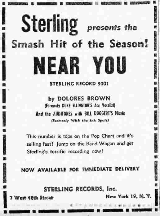 A one-time canary for Duke Ellington, the sultry tones of Dolores Brown's chanting spins to best advantage for the rhythm ditties where the ditty makes no real demand for vocal quality. Moreover, gal gets a much needed vocal lift in the assisting harmony blend of the Auditones, whose rhythm singing spins brighter and with more luster than the soloist. And with Bill Doggert's [sic] Music (piano, bass and guitar) sustaining the rhythmic pace, it's passing plattering for "Near You" and a Harlemese "Good Deal" jive novelty. However, gal sinks under for the mated slow ballad sides. Popularity of "Near You" may attract some coins in that cutting at race spots.